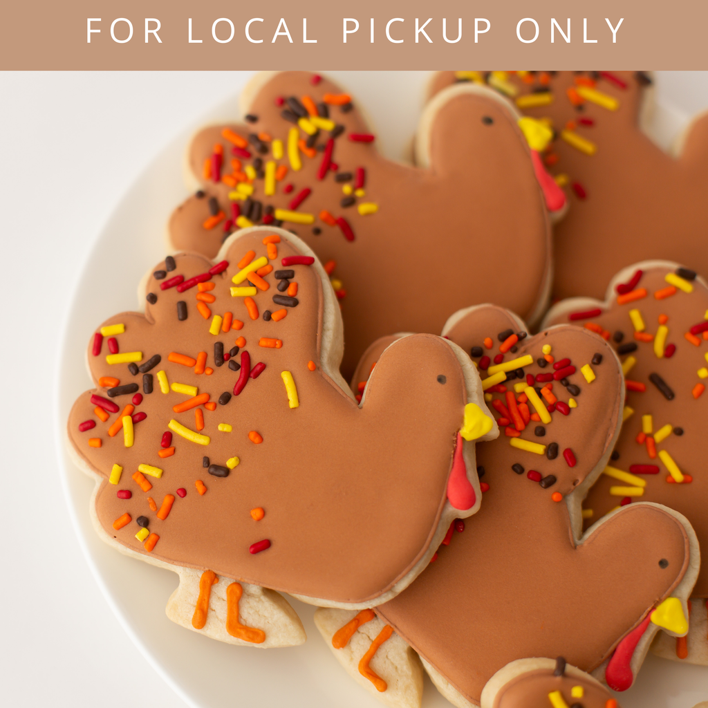 As you gather to give thanks this Thanksgiving, delight in the sweet joy of COOKIES! Our gourmet cookie gift box is the perfect treat for your family's celebration. Inside, you'll find a dozen adorable turkey sugar cookies, each made with real butter and hand-decorated with precision using traditional royal icing. Crafted by our talented cookie artists, these charming turkeys are sure to add a special touch to your Thanksgiving gathering.