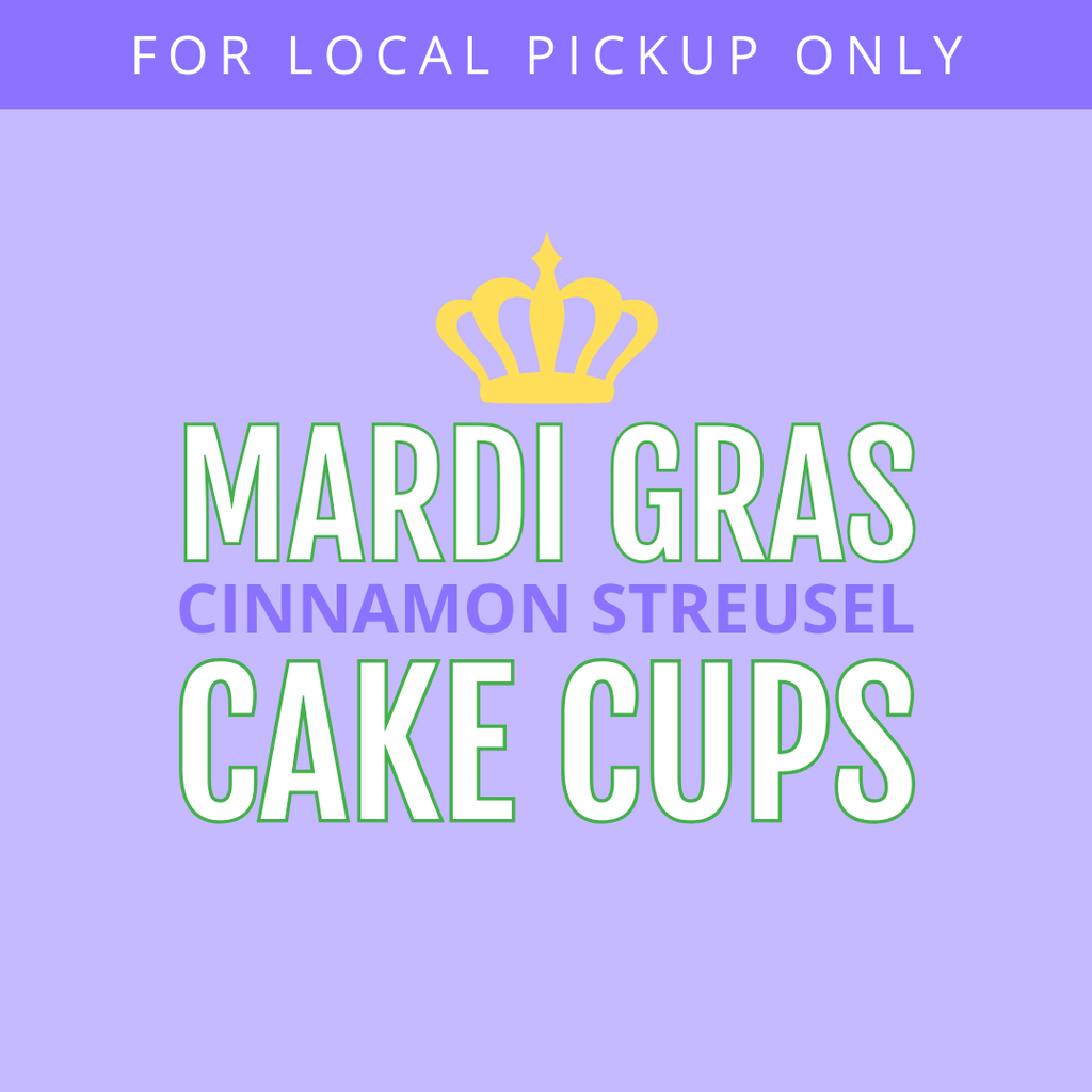 Grab half a dozen Mardi Gras Cake Cups and snack like a parade pro. Layers of cinnamon streusel cake + cinnamon buttercream, topped with purple, green & gold sprinkles....